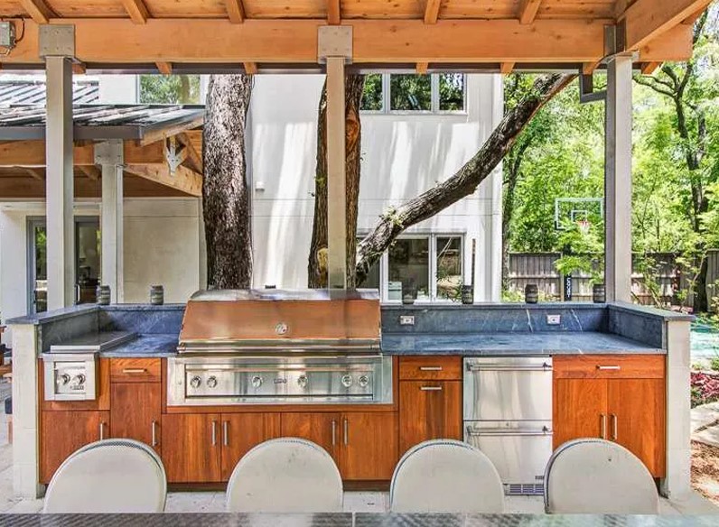Per i piani da lavoro, invece, si consiglia la pietra estremamente resistente e molto bella da vedere. Se lo spazio ve lo permette sarebbe comunque sempre consigliabile riparare la vostra cucina al di sotto di un capanno o di una tettoia: non solo la pioggia e il sole aggrediscono il materiale, ma il vento può spesso rendere difficile la cottura.